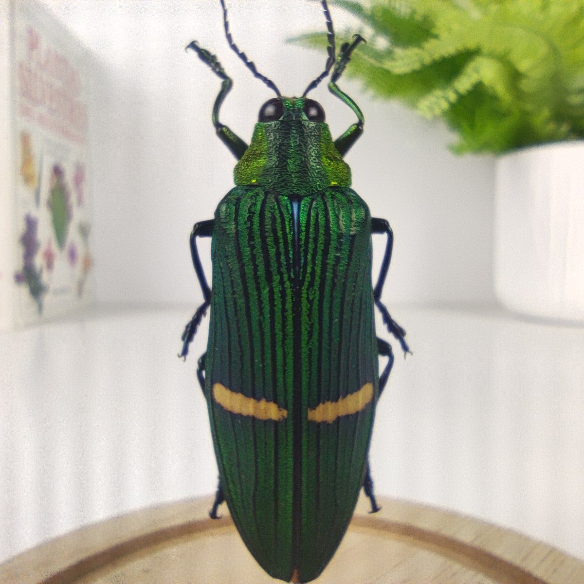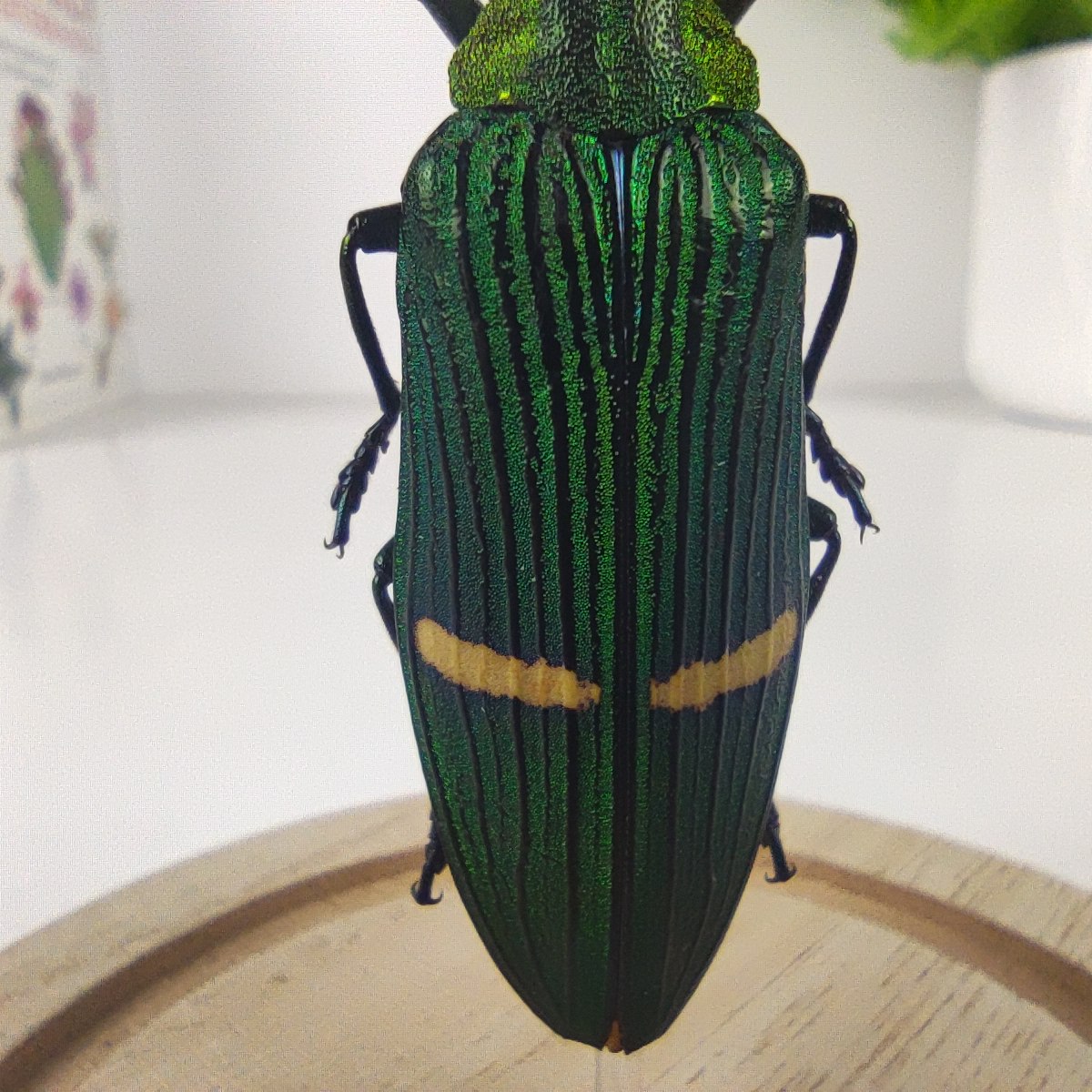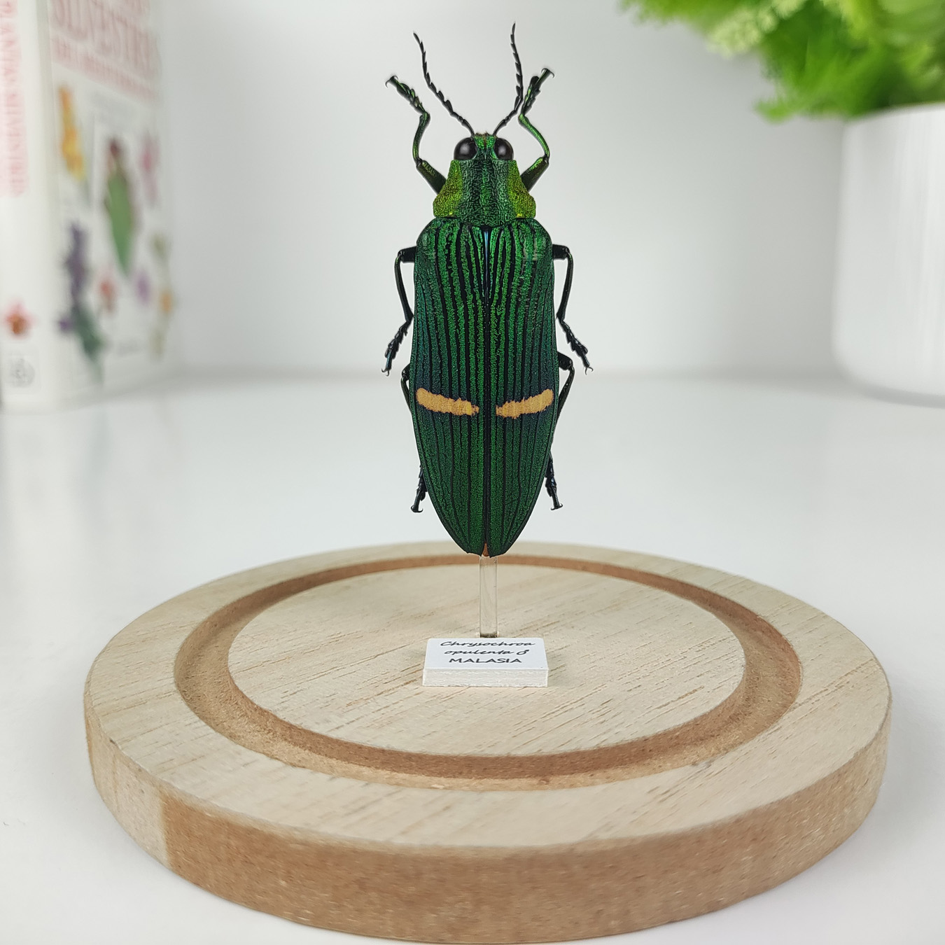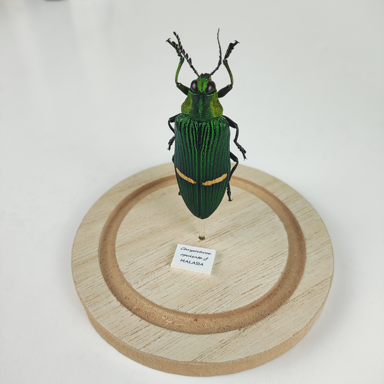 Este coleóptero verde metalizado y con un espectacular color verde de Malasia «Chrysochroa opulenta» con forma de barco llenará con su presencia cualquier rincón de tu entorno.
