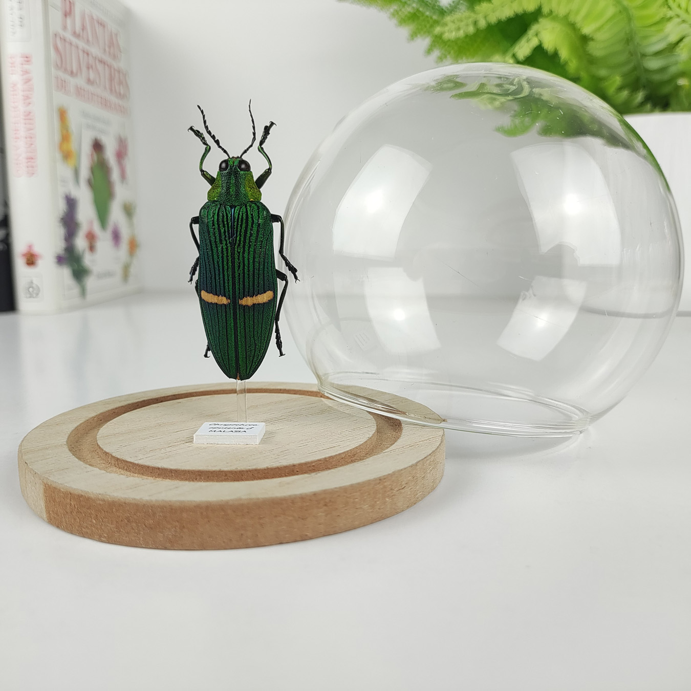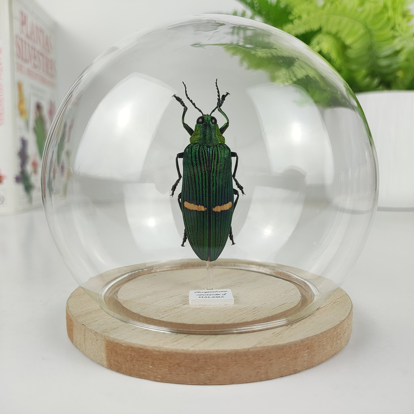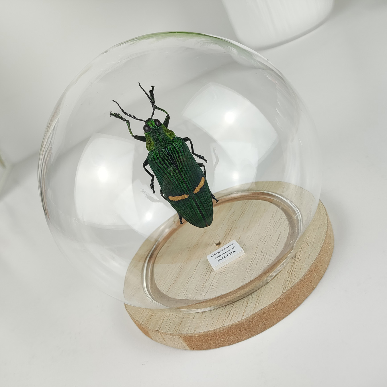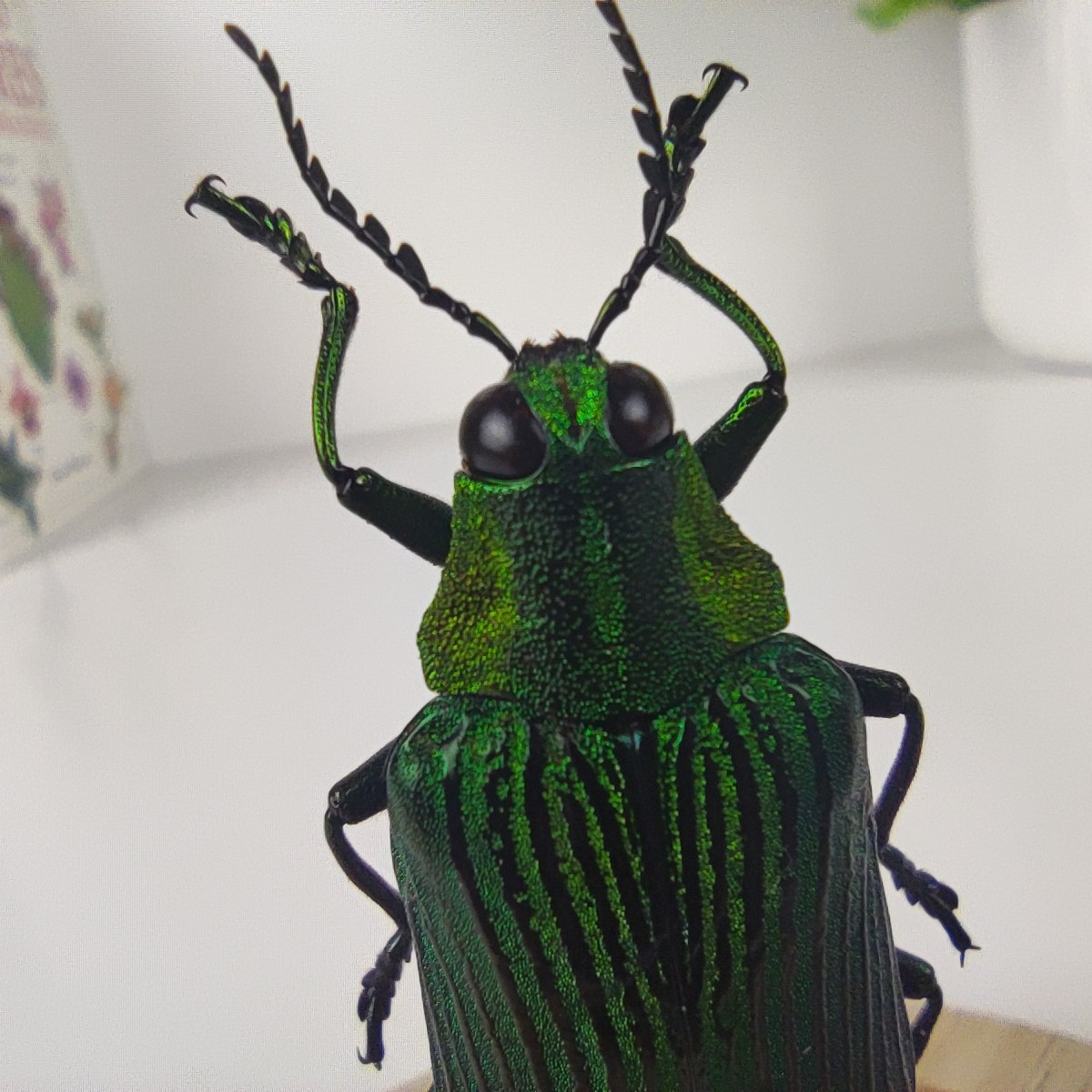 Este coleóptero verde metalizado y con un espectacular color verde de Malasia «Chrysochroa opulenta» con forma de barco llenará con su presencia cualquier rincón de tu entorno.
