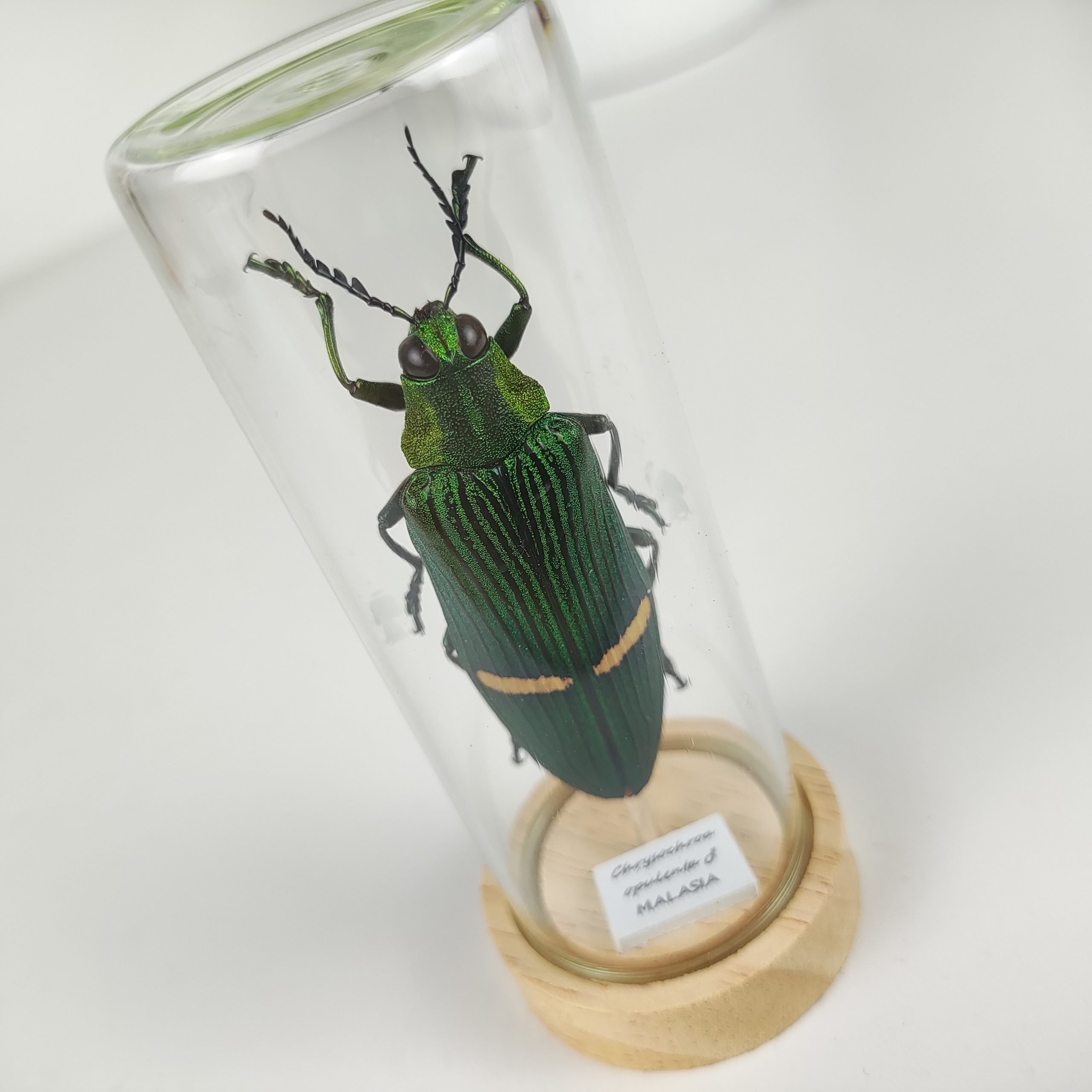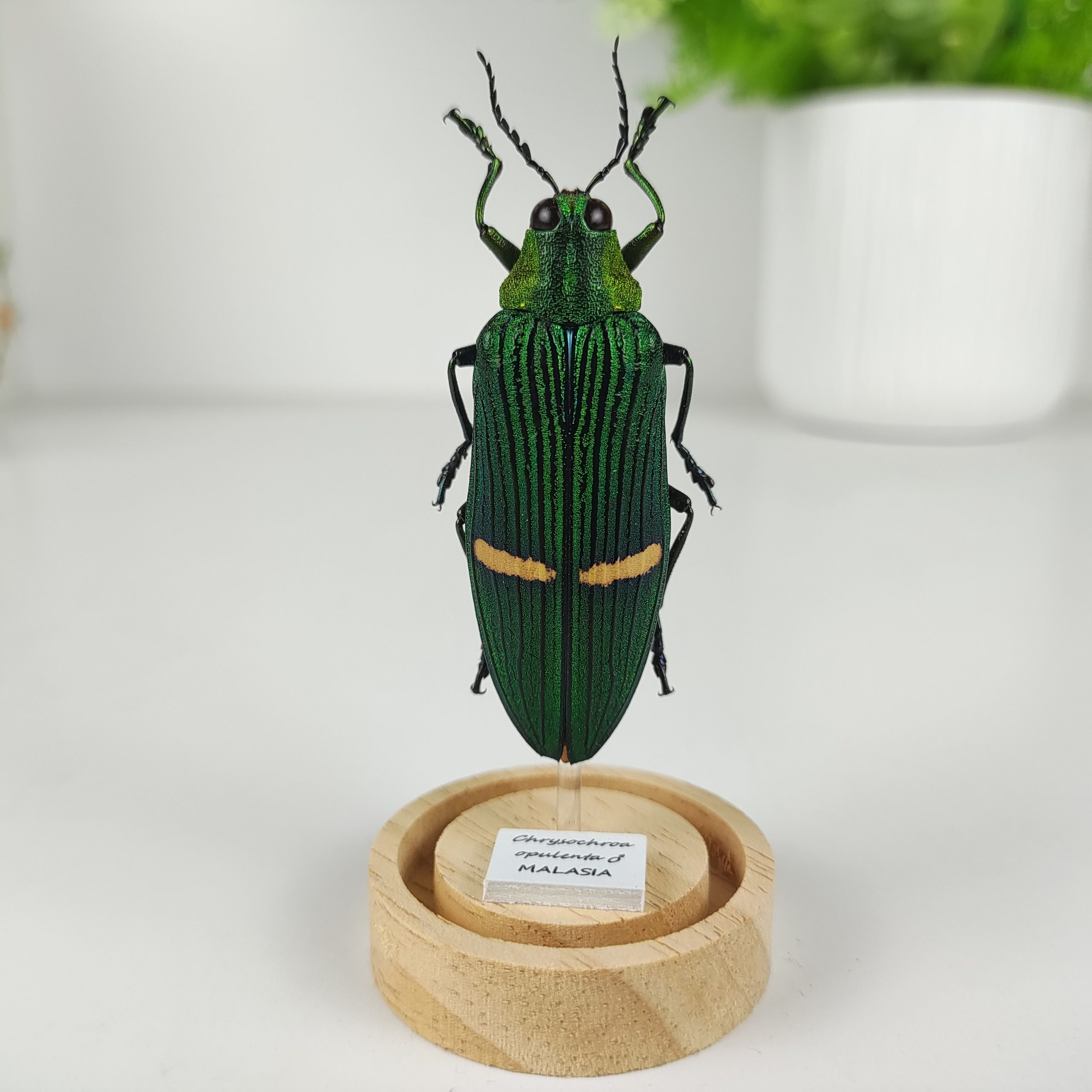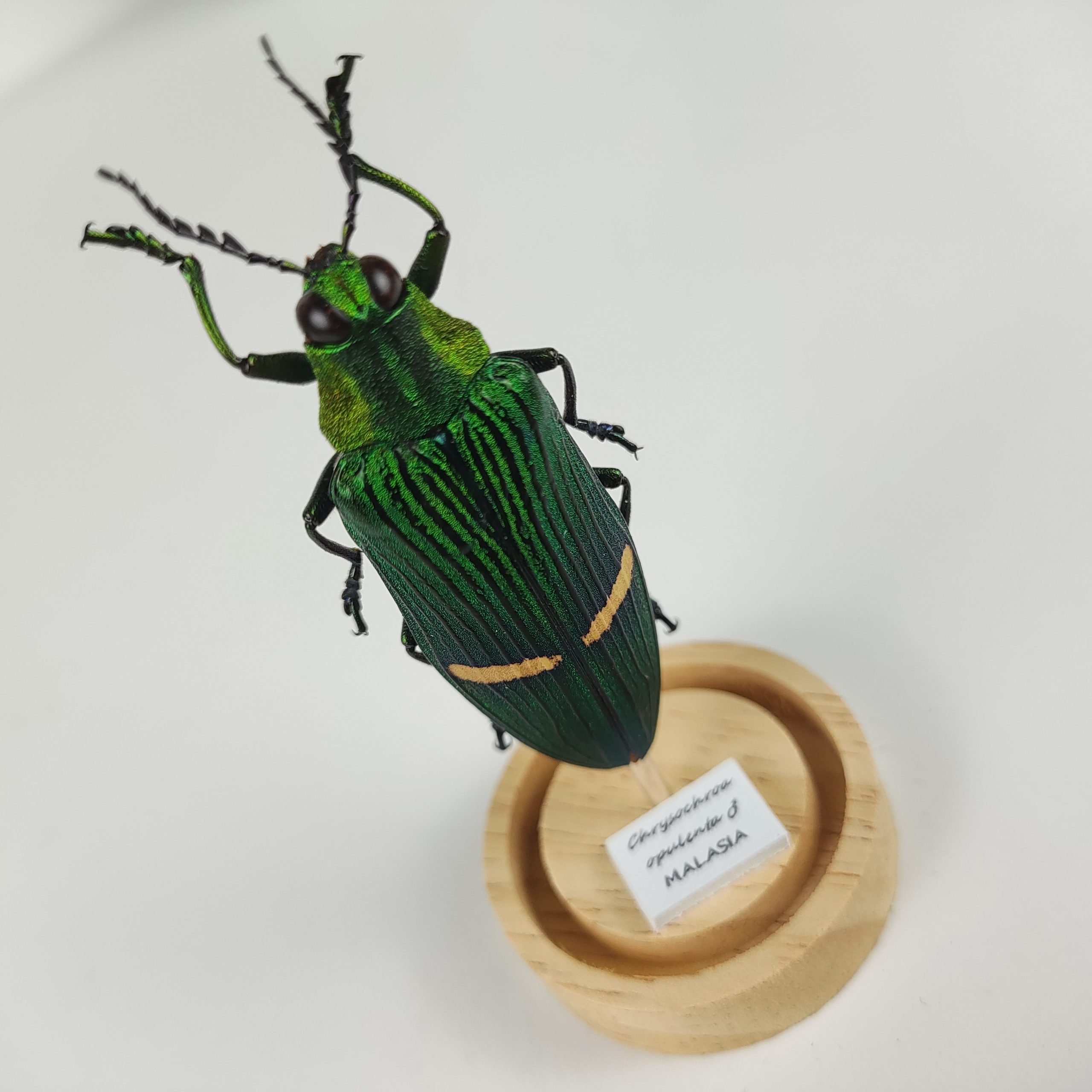Escarabajo taladro de la madera con un precioso diseño y color típicamente procedente de Malasia. Su curiosos diseño y su brillo metálico llenarán de color cualquier espacio.