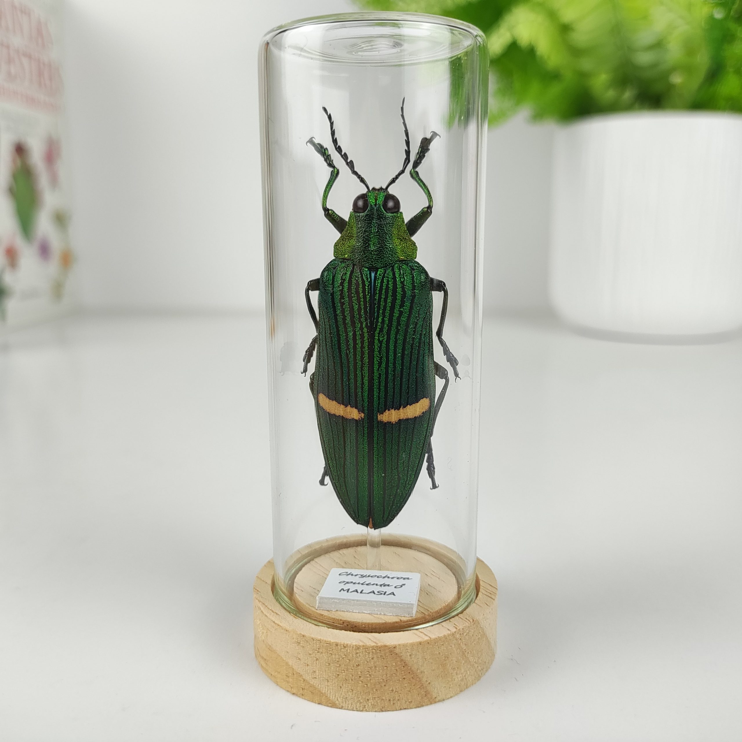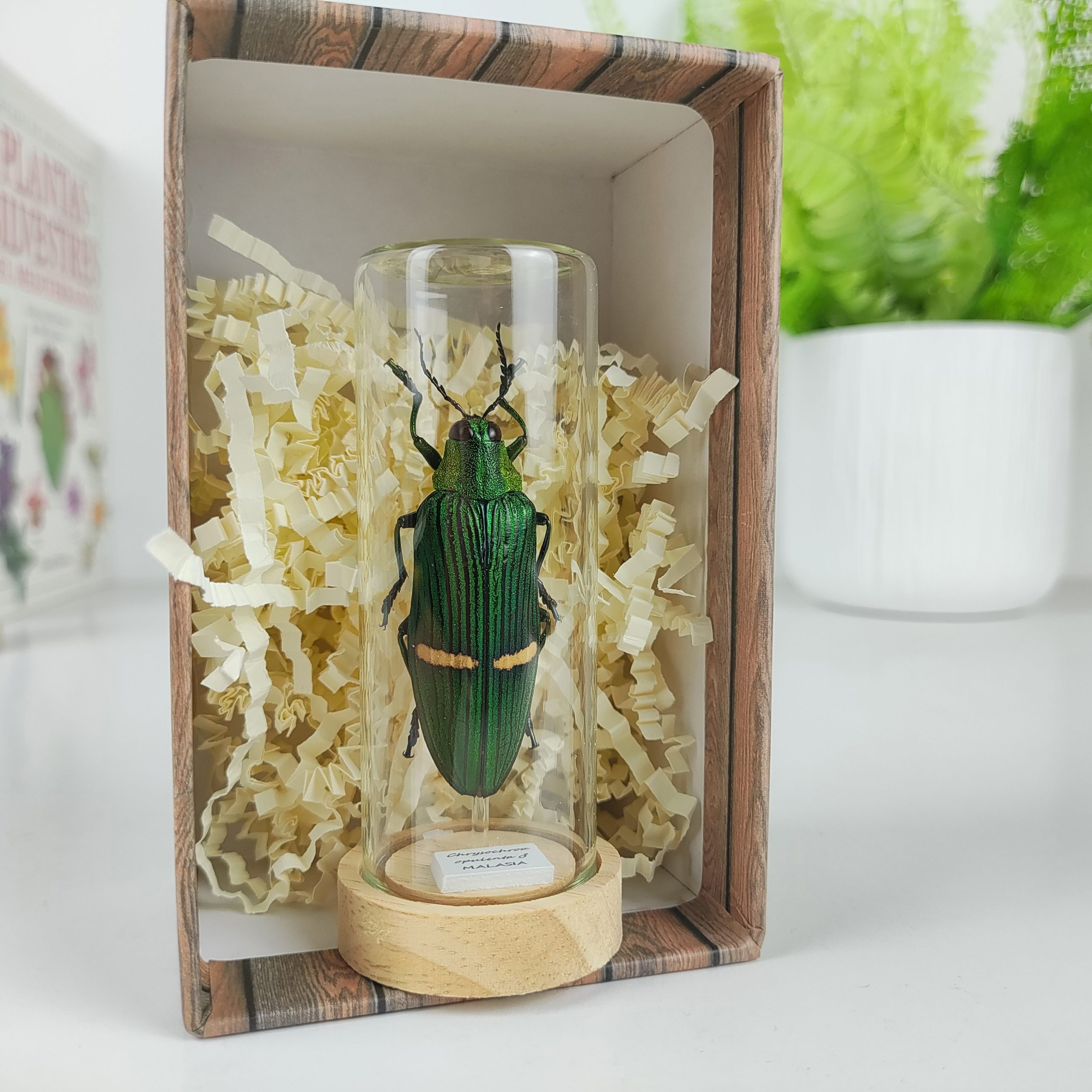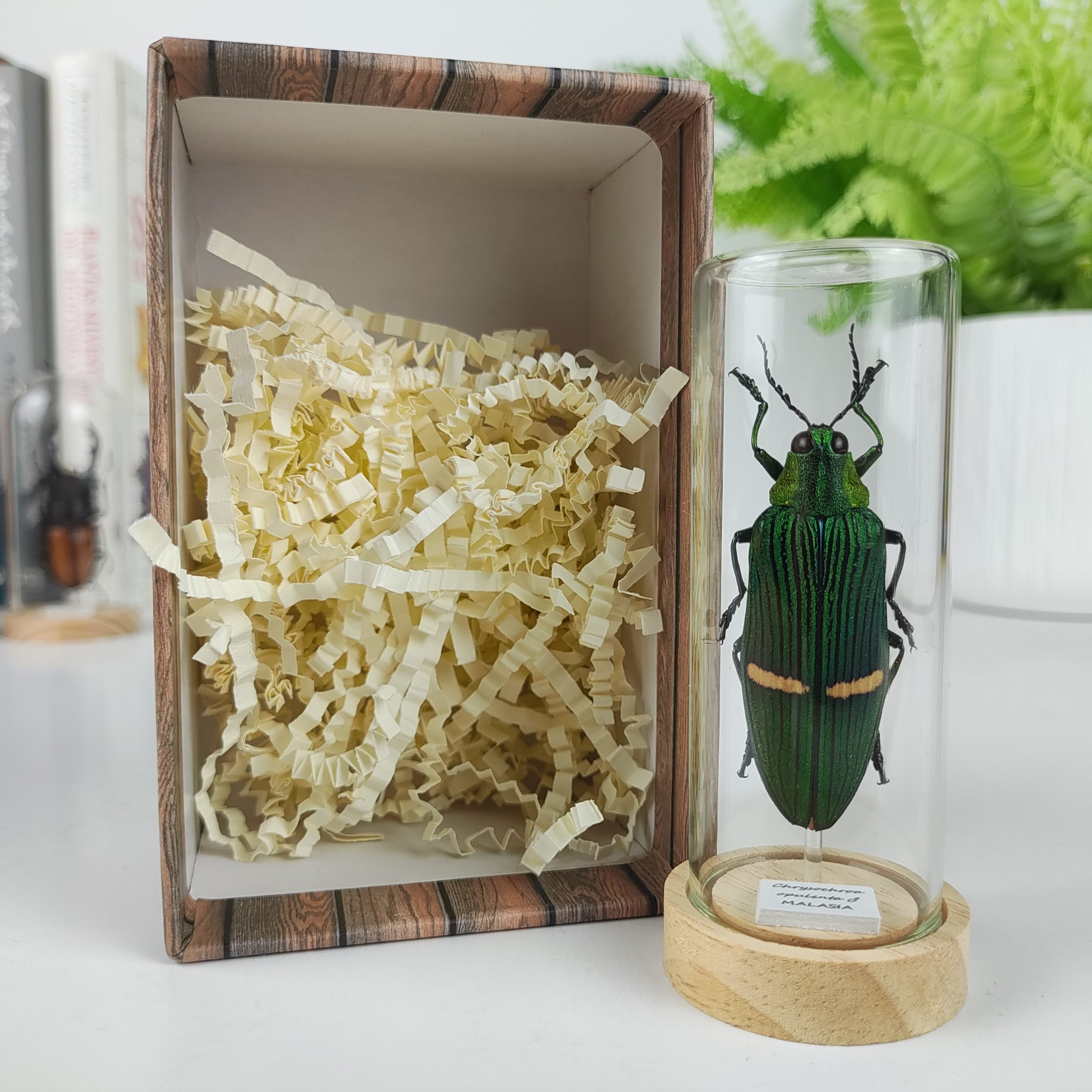 Escarabajo taladro de la madera con un precioso diseño y color típicamente procedente de Malasia. Su curiosos diseño y su brillo metálico llenarán de color cualquier espacio.