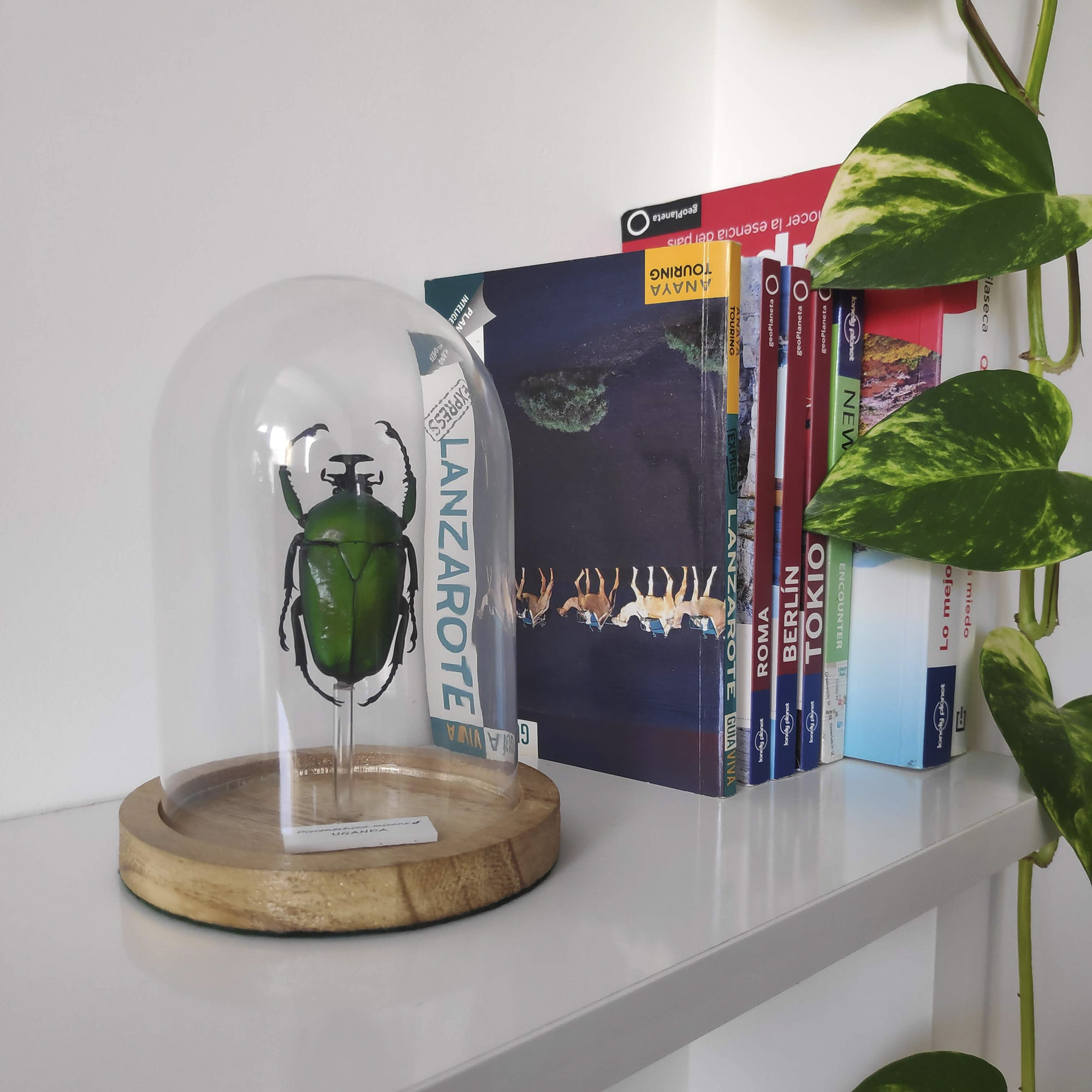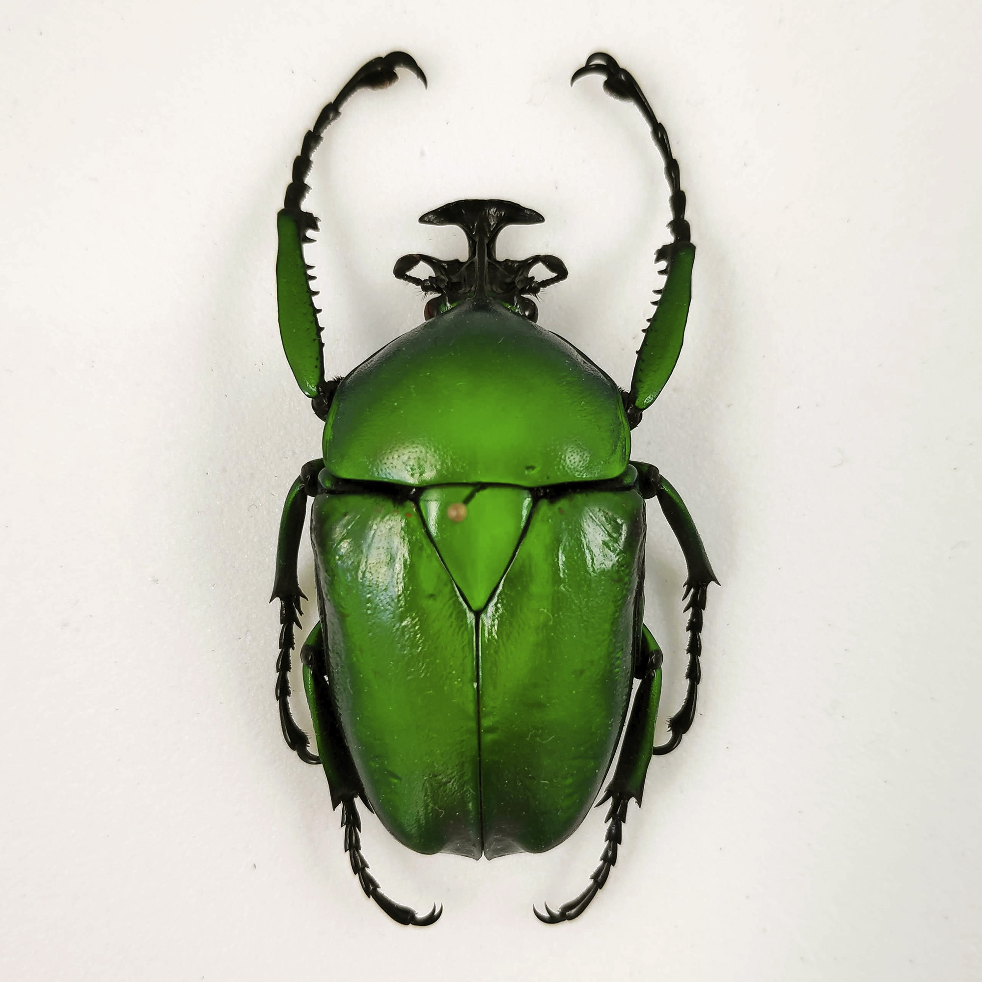 Escarabajo color verde esmeralda de 3,5 cm Dicronorhina micans procedente de UGANDA. Sus infinitos brillos llenaran de color cualquier espacio.