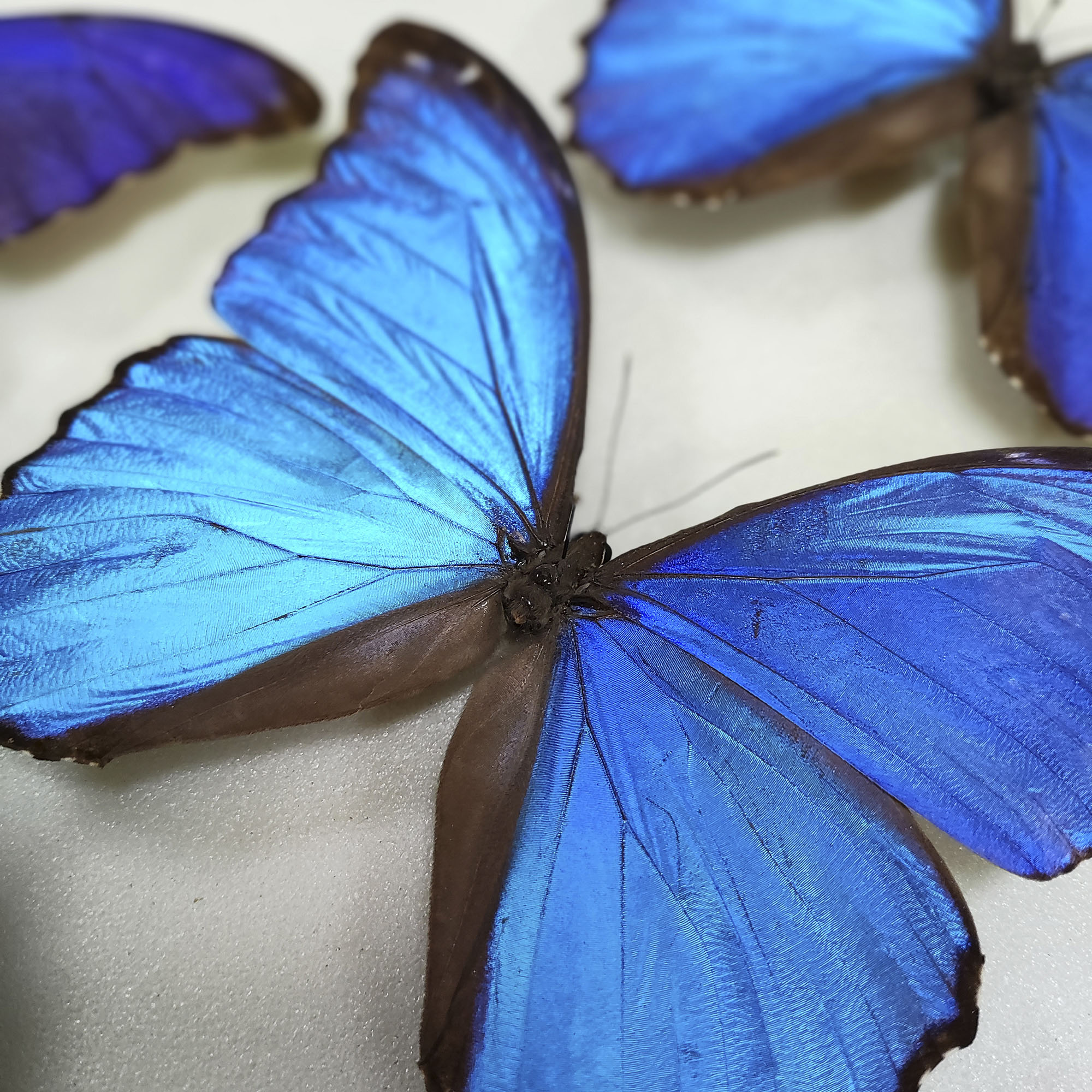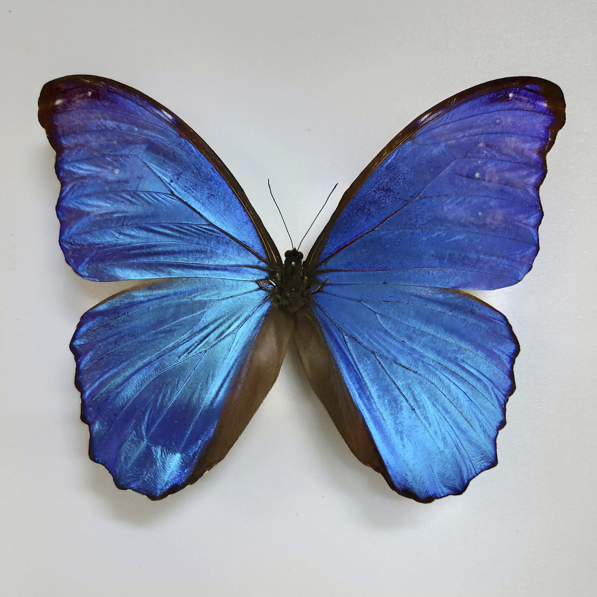 La mariposa azul más espectacular del mundo, la Morpho didius. Con infinitos destellos de todas las tonalidades de azules esta mariposa peruana es perfecta para llenar de color cualquier espacio. Un toque diferente para tu casa, evento u oficina que no dejará indiferente a nadie.