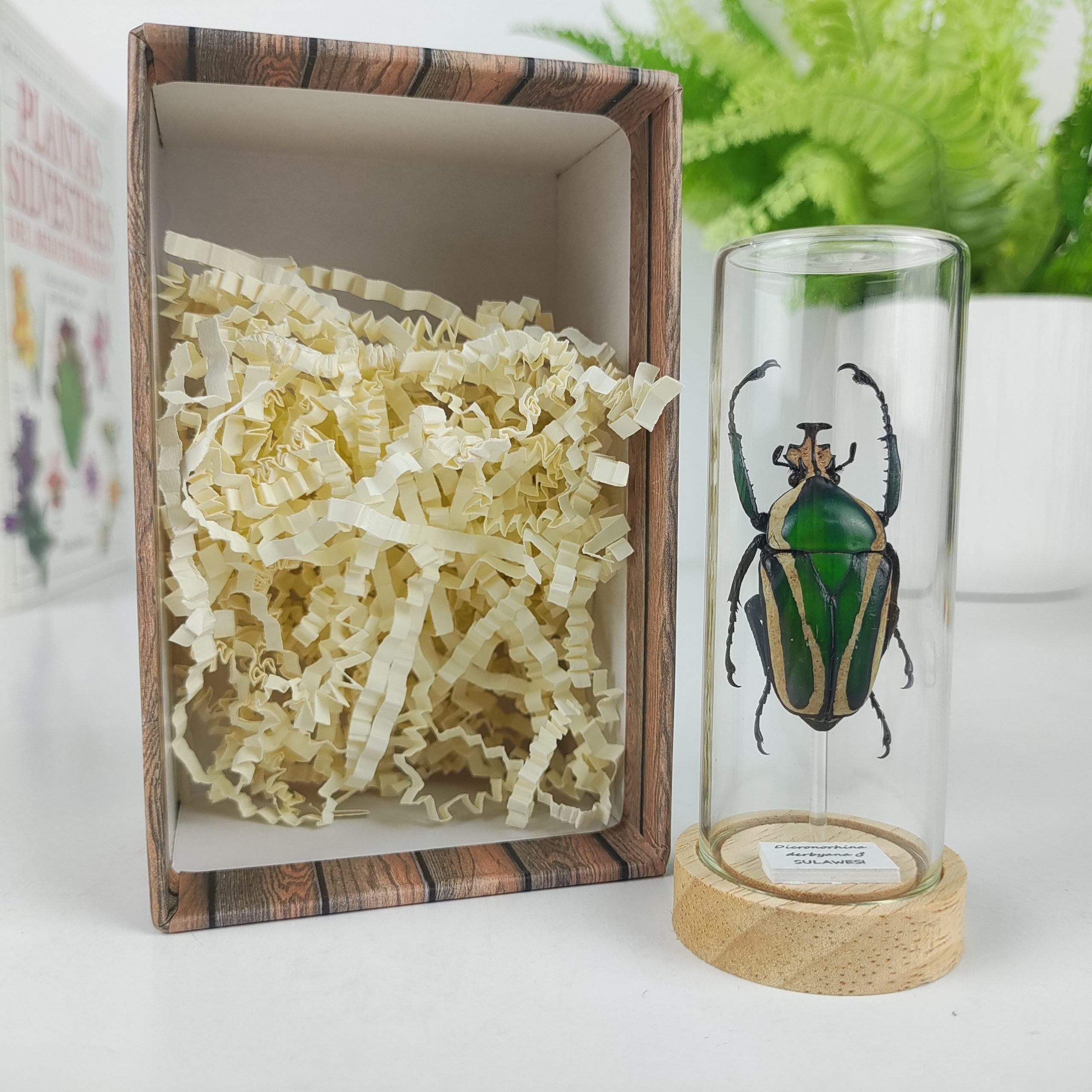 Dicronorrhina derbyana (Macho) – Este coleóptero verde brillante con bandas blancas, hermano del gigante Goliathus vuela por las selvas del Congo y países cercanos. Sus colores y su diseño llenarán de color cualquier espacio.