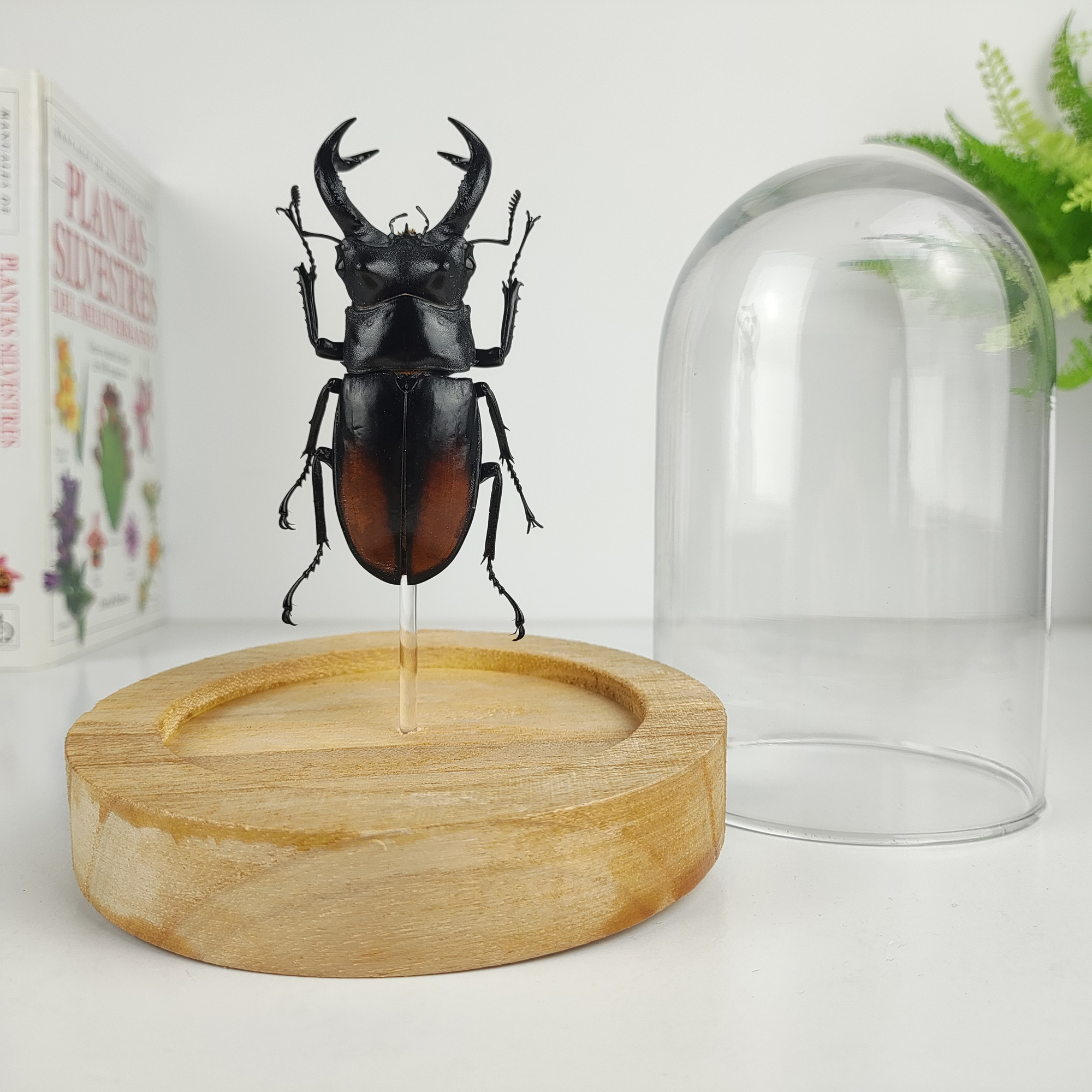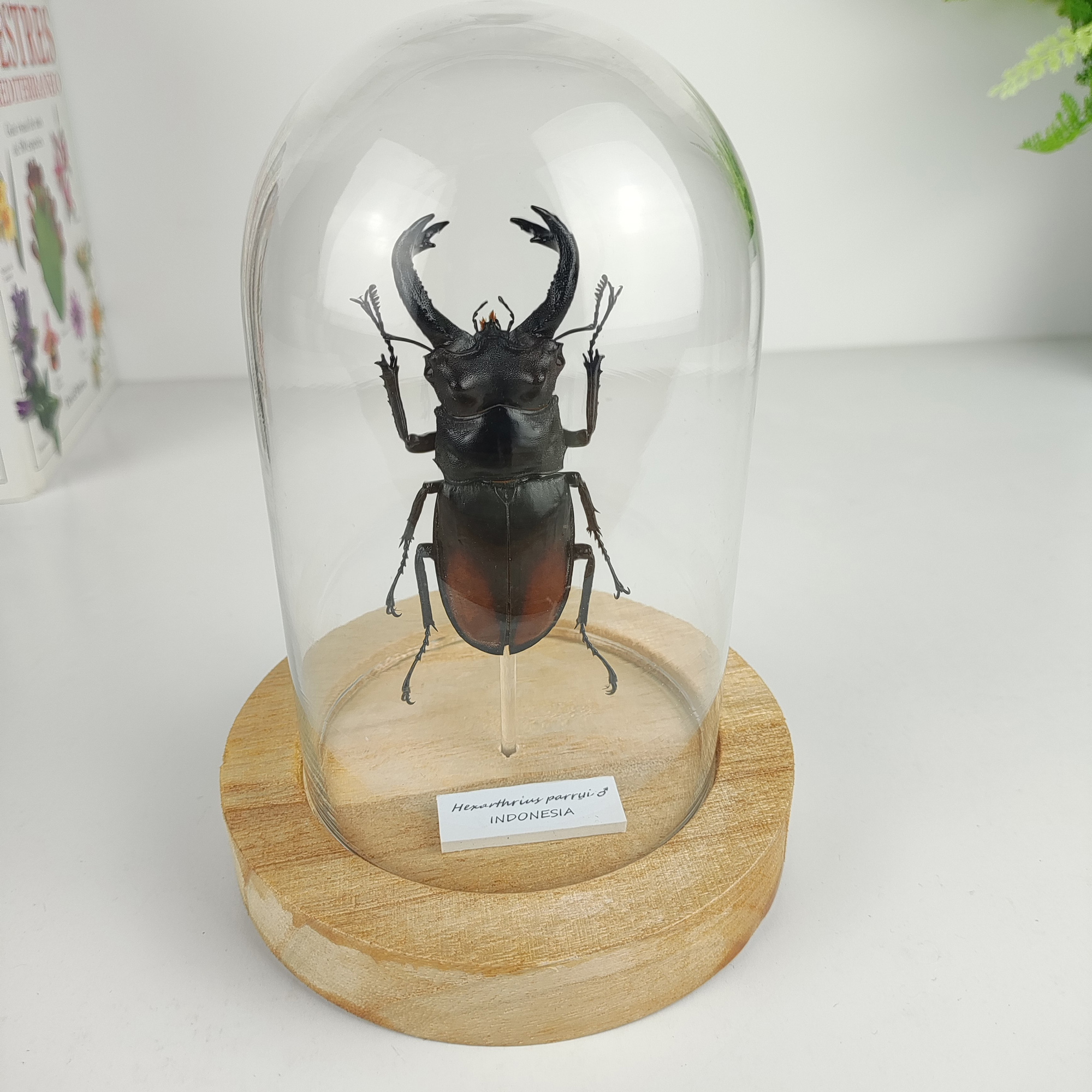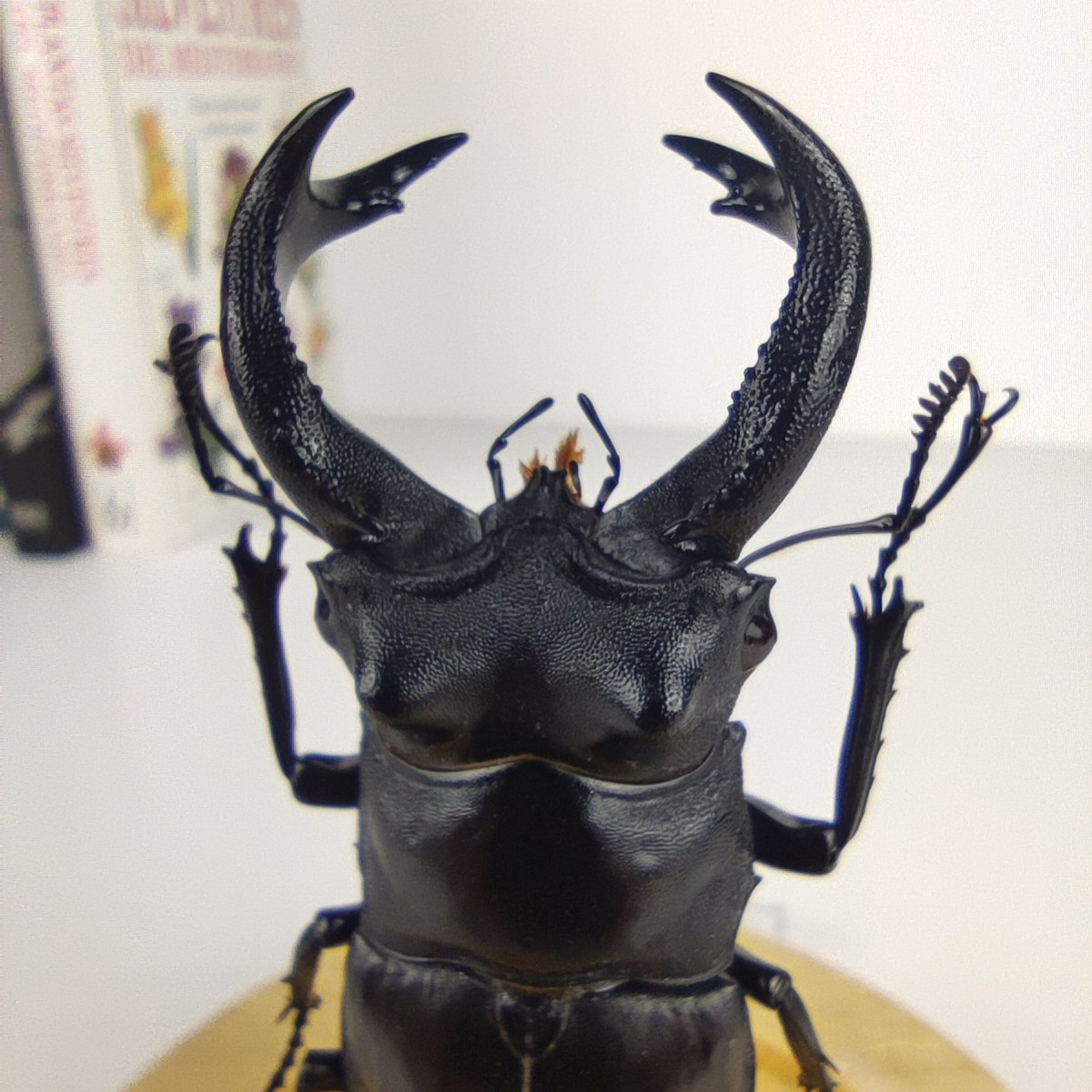 Gran macho de Ciervo Volante que parece tallado en madera procedente de las islas de Indonesia. Su impresionante aspecto y su bello color caoba llenaran de color cualquier espacio.